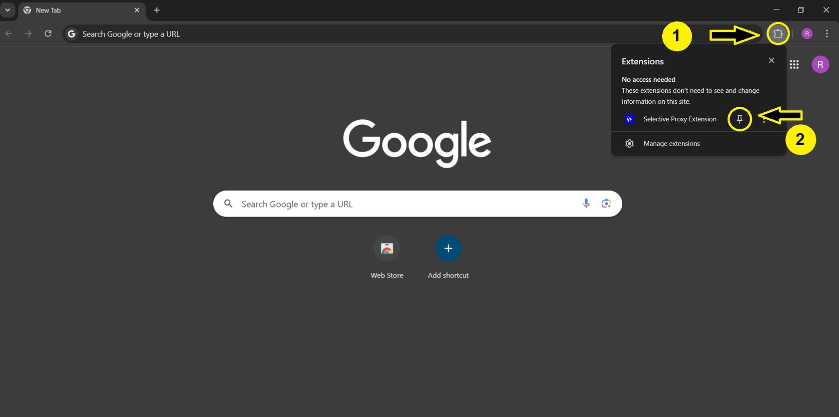 Click the puzzle piece (1) in the top right of your browser. Then, click the little pin (2) next to the extension: